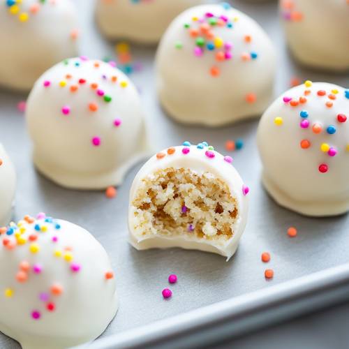 Melt the white chocolate in a microwave-safe bowl, stirring every 20 seconds to avoid burning. Dip the tip of each cake pop stick into the melted chocolate and then insert it halfway into each cake ball. This step helps secure the stick in place once the chocolate hardens. Once the sticks are set, dip each cake pop into the melted chocolate, covering it entirely. Place the coated cake pops back onto the parchment paper to set. Decorate with sprinkles before the coating hardens.