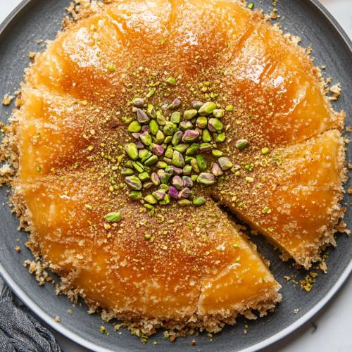 - Prepare the Syrup (Optional but Recommended): While the knafeh is baking, make a simple sugar syrup by boiling 1 cup sugar and 1/2 cup water until slightly thickened. Add a squeeze of lemon juice and let it cool.