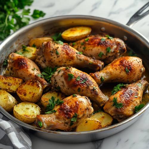 - Transfer the chicken and potatoes to a baking dish, spreading them out in a single layer.