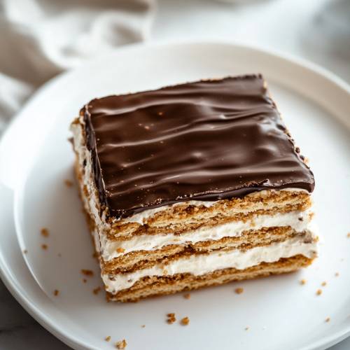 Repeat the layers, alternating pudding and crackers, finishing with a final layer of crackers on top. - Add the Chocolate Topping: Warm the chocolate frosting in the microwave for about 20 seconds (until it’s soft enough to spread easily). Stir it well, then spread evenly over the top layer of crackers. This creates the perfect chocolate coating!